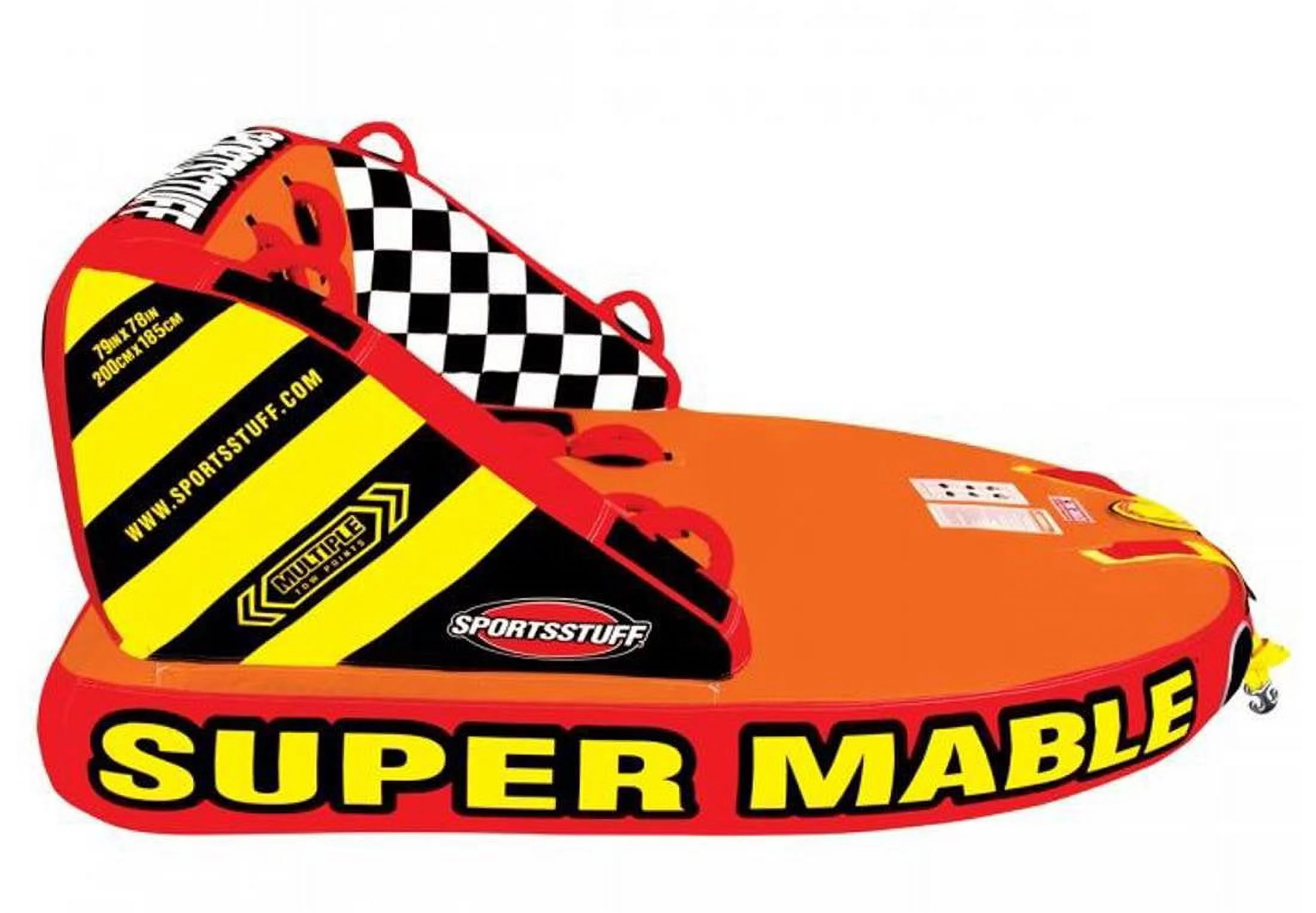 The Super Mable from Sportsstuff is designed for 1 to 3 riders, offering versatile riding options. It features dual tow points for a thrilling ride with a comfy backrest or a chariot-style experience. Equipped with EVA foam seating pads and multiple double webbing foam handles with knuckle guards, it supports various riding positions. Air-cushioned side walls and a high backrest ensure stability, while custom graphics add style. Enjoy an action-packed day on the water or relax using it as a deluxe lounge.
